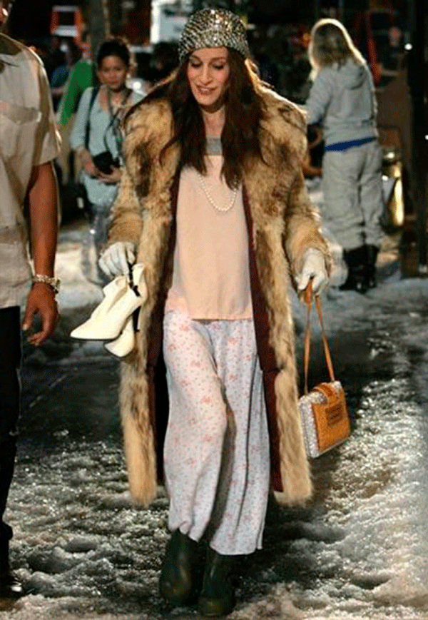 Tão atual com o nosso momento, não é mesmo? Estou em casa de pijamas e lembro que tenho que comprar papel higiênico… Coloco meu casaco de peles e minhas perolas e vou plena no mercadinho. Brincadeiras a parte… Essa tendência de pijamas e camisolas esta cada vez mais presente nas ruas, mas… para Carrie, tem que ter combinações inusitadas, afinal, é a Carrie né…