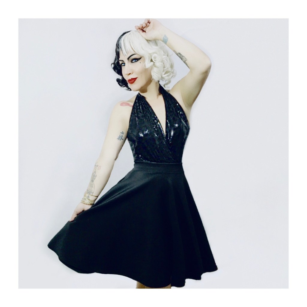 Outro que amo é o Total Black, com essa pegada cinquentinha… Essa saia godê guarda-chuva paguei apenas dois reais em um Bazar de Igreja, já este boddy novinho e todo bordado no paetê, foi desapego de uma amiga.