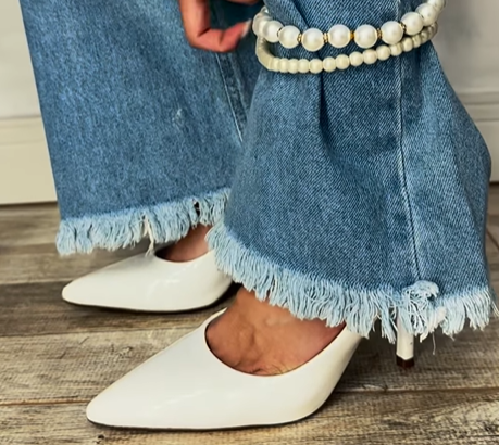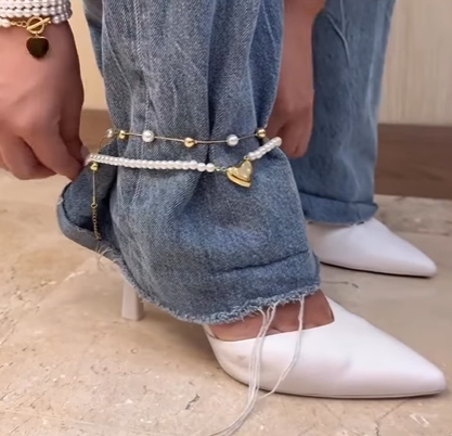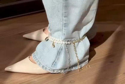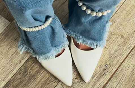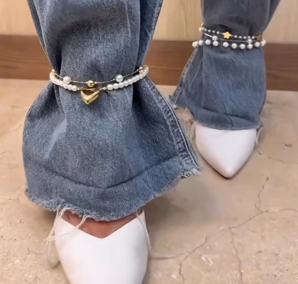 Você pode adicionar colares de pérolas, pedrarias ou outros adornos às barras das suas calças jeans, criando um visual personalizado e moderno.