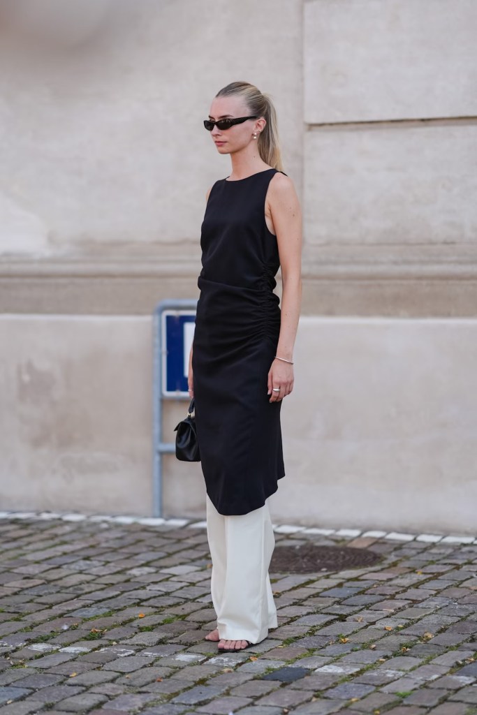 Mas se for pra lacrar, quero vestido chique, neutro e preto — tipo mini slip dress+ pantalona fluida com uma certa transparência, muitos acessórios como: mix de colares, pulseiras e uma mega argola. É pra fechar o look uma bolsa baguete que é ao menos tempo Moderna e viaja no passado.”
